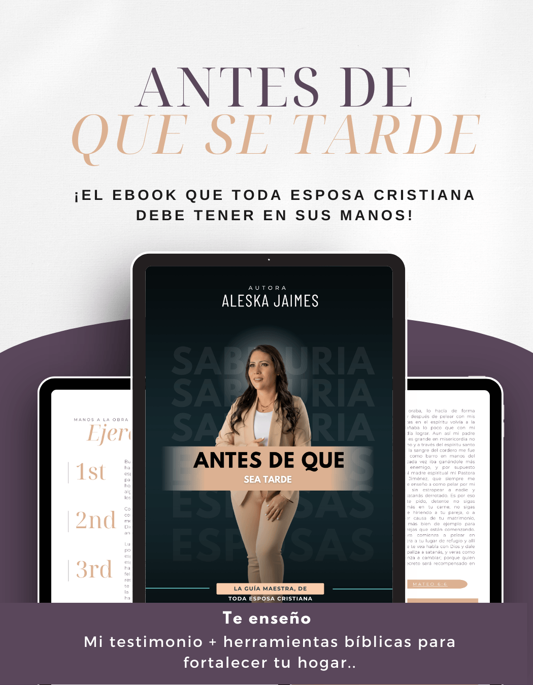 El E-book “ANTES DE QUE SEA TARDE” es más que una simple guía teórica. No solo te ofrece principios bíblicos sobre el matrimonio, sino que también te brinda estrategias prácticas y ejercicios aplicables para que puedas implementar lo aprendido en tu vida diaria. Cada enseñanza está respaldada por la Palabra de Dios y mi experiencia de más de 14 años como predicadora y consejera matrimonial. Está diseñado específicamente para mujeres cristianas que desean transformar su matrimonio a la luz de la sabiduría divina.